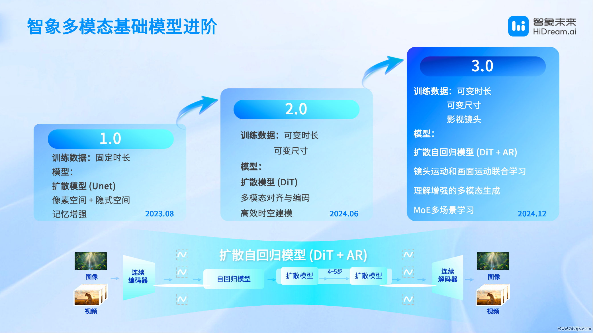 本事层面,智象多模态基础模子历经三次渊博迭代,构建起 “连气儿深、终结准、画质高” 的中枢上风。模子从 2023 年 8 月的 1.0 版块(扩散模子 DiT,末端多模态对王人),到 2024 年 6 月 2.0 版块(扩散自追念模子 DiT+AR,强化时空建模),再到 2024 年 12 月 3.0 版块(MoE 多场景学习,顾忌增强),握续冲突生成本事瓶颈。