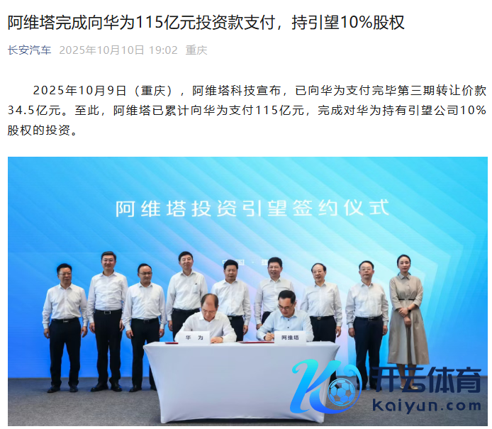 IT之家 10 月 10 日音信,阿维塔科技 10 月 9 日书记,已向华为支付已矣第三期转让价款 34.5 亿元。至此体育游戏app平台,阿维塔已累计向华为支付 115 亿元,完成对华为合手有引望公司 10% 股权的投资。