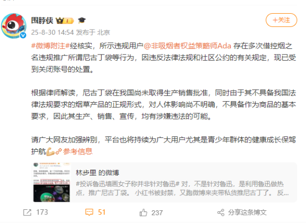 8月30日,投诉“鲁迅夹烟”墙画确当事东谈主孙女士@非抽烟者权利计策师Ada 微博账号被封。 据微博社区不雅察员官方账号@围脖侠 ,经核实,所示违纪用户@非抽烟者权利计策师Ada 存在屡次借控烟之名违纪实施所谓尼古丁袋等动作,因违背法律规章......